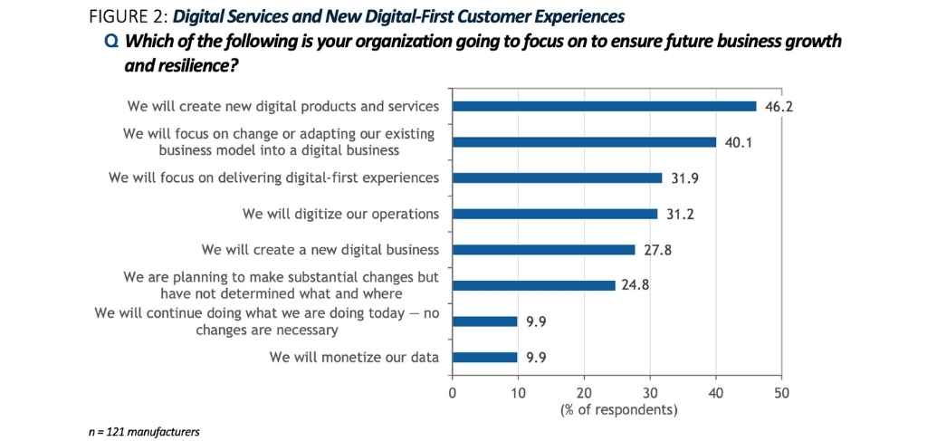 Competition has forced manufacturers and service organizations to rethink how they strengthen bonds with customers, which wasn’t historically necessary as they owned the customer life cycle. In IDC’sNovember 2020 COVID-19 Impact on IT Spending Survey, nearly half of manufacturers said they prioritize creating new digital products and services and now look to deliver digital-first customer experiences —46.2% and 31.9%, respectively (see Figure 2).