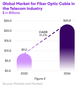 In parallel to 5G rollouts, telcos will continue to deploy fiber optic cable to support their broadband internet and long-haul backbone networks. According to Market and Markets, the global fiber optic cable market was $9.2 Billion in 2020 and it is forecast to reach $20.8 Billion by 2026. Several factors are driving this growth. First, the demand for high-speed home internet connections has increased exponentially as millions of workers around the globe switched to work from home models.