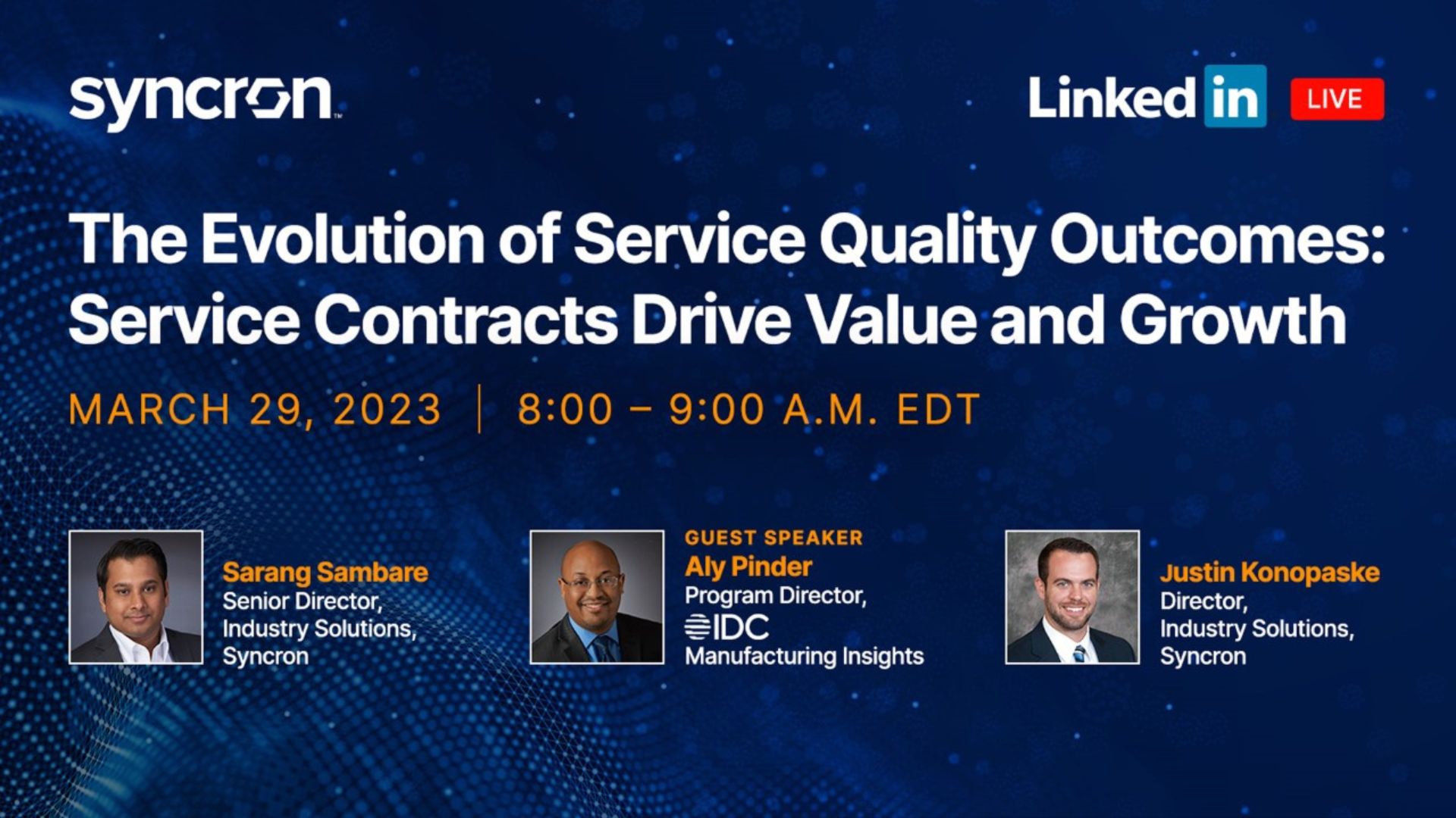 Sarang Sambare and Justin Konopaske from Syncron will be joined by Aly Pinder, Program Director at IDC, to discuss the latest strategies and technologies that can help manufacturers and service leaders overcome the challenges associated with service contracts.