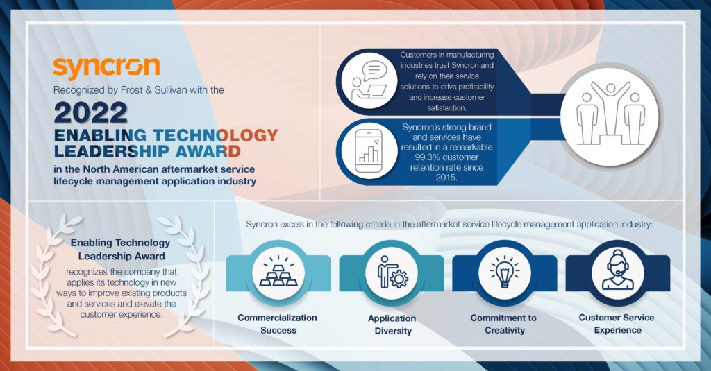 Recently, Frost & Sullivan assessed the aftermarket service lifecycle management application industry and, based on its research results, recognizes Syncron with the 2022 North American Enabling Technology Leadership Award.